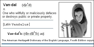 Those of you who managed to stay awake during Western Civ. class will recall that the Vandals were one of the Germanic tribes that sacked Rome. They weren't any more or less destructive than any of the other tribes that got all up in Rome's shit, but they still have the distinction of lending their name to toilet-paper-hurling dipshits from now to eternity.