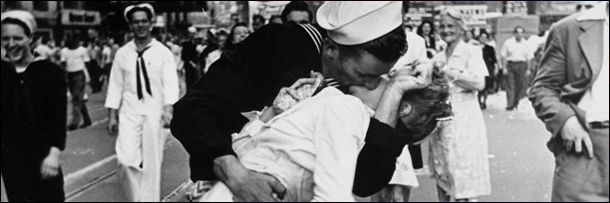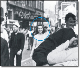 The one with the best story, however, has to be George Mendonsa, who had his picture analyzed by the Mitsubishi Electric Research Lab (MERL) in Cambridge, Mass., to prove his identity. He claimed to have been drinking fairly generously on V-J Day and was on a date with the woman he would later marry. They left a movie and saw crowds of people in the street screaming that the war had ended. He saw a nurse walking by, and he kissed her. The kicker: according to Mendonsa, his wife is actually in one of the pictures in the background. And she's apparently into "open relationships," because she's smiling pretty broadly.