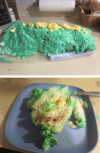 The end result resembled Guy Fieri if he was hit with some sort of science fiction devolution ray and assumed the biological form of a sea cucumber. Did you know that sea cucumbers can shit out their internal organs in case of an emergency? That's the closest parallel to the sandwich loaf that works: free-floating sea cucumber intestines. If Guy Fieri were a sea cucumber, his shit-organs would come out tempura-battered, with a side dish of Yee-Ha-Aloha Chipotle Tabasco poi.