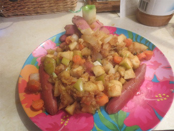 The Frankfurter Spectacular was no Liverwurst Pineapple -- few things are -- but it was a far better nickname for one's genitals, so it deserved consideration. I began by slicing and broiling wieners while cooking spiced and seasoned apple, carrot, and pineapple in a skillet. I then acquainted the hot dogs with my UN General Assembly of disco flavors.