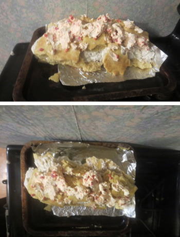 Behold the Oriental Shrimp Sandwich Roll, a ghastly tube which contains enough cream cheese for the past 500 years of Chinese cooking. I dumped shrimp, pecans, pineapple, walnuts, and water chestnuts into a paste that looked like the contents of a Red Lobster dumpster -- or Cthulhu's diaper. I rolled up this barely-Asian slurry into a starchy roll (which immediately fell apart) and plastered it with more cream cheese. After chilling it in my increasingly angered fridge, I took it out. It didn't smell too bad, so I decided to try some. This was a mistake.