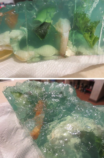 Behold the Aspic Aquarium, an artifact from a bygone era when it was socially acceptable to serve your dinner guests the crude facsimile of several gallons of kelpy poop water. I managed to make a blue-dyed, no-flavor jello mixture. When it was nearly firm, I plopped in macaroni shells, cauliflower coral, carrot fish, parsley seaweed, and shrimp shrimp. The result? Firm and radiant, like a freshly-carved cube of Pripyat pond water.