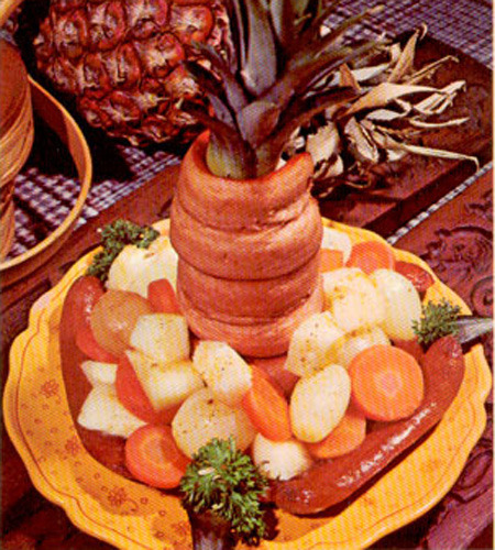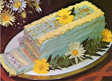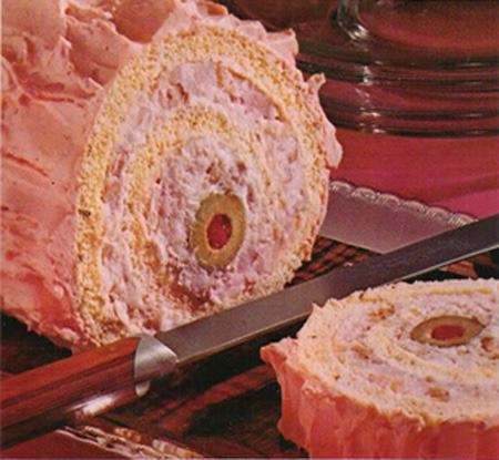 Hailing from 1973, the Sandwich Loaf resembles a Carvel Cake made out of uranium-enriched toothpaste, or perhaps something from that scene in Hook in which the Lost Boys eat a pile of glue. It's easy to make! Just find a shit-ton of bread crusts and gloop them with salmon-lemon-juice-mayo-celery-scallion paste, cream-cheese-onion-walnut-sour-cream filling, hard-boiled-egg-pimento-mayo, and olive cream cheese until it looks a Dagwood Bumstead sandwich, if the comic strip Blondie was about an adult man whose only pleasure in life was having sex with large sandwiches instead of his hot wife.