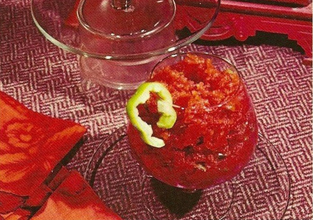 Fortunately, this recipe was far easier than the previous diarrhea rainbow: heat up some clear gelatin, then add tomato juice, garlic salt, broth mix, lemon juice, green pepper flakes, and cloves, then chill and carve. Congratulations, you're now serving your guests frozen spaghetti sauce, like Dracula's sad brother Roycula, who collects Hummel figurines and goes to bed at midnight even though he wakes up at 9:30 p.m.