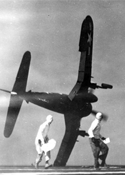 ... except that, once it took off from an aircraft carrier, landing back onto one was nigh on impossible. If the aircraft didn't stall out and plop into the ocean before making contact with the carrier, any attempt to land would send it bouncing around like a Super Ball, careening across the deck or flipping over entirely.