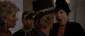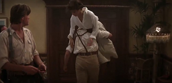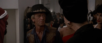 Later in the movie, there's even a callback to this terrible scene. Crocodile Dundee attends a swanky dinner party where the hostess has a deep, masculine voice. So again a suspicious Dundee grabs her genitals, in what we now have to assume is some kind of ceremonial Australian greeting.