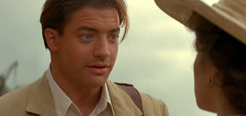 Throughout the entire movie, Fraser's character (we're 90 percent sure his name was Handsome McMummy) treats her like absolute crap, ostensibly for comedic effect. Keep in mind, there's no arc for Fraser wherein he learns not to do this, because acting like she's an object is rewarded at every turn. When their boat is attacked, he saves the day by hurling her into the water without so much as asking: