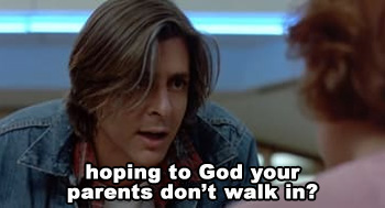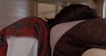 The worst moment, which Ringwald highlights in her essay, comes when Bender is sneaking under the desks then stops to look up Claire's skirt, complete with a POV upskirt shot filmed in glorious Perv-O-Vision. This would all be bad enough, but then, one-upping the cringe factor, he shoves his damn face in her crotch.