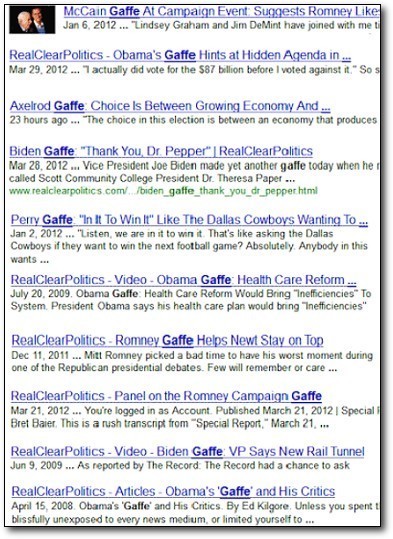 If you're new to following politics, trust me when I say you will grow to absolutely hate the word "gaffe." Go to a news portal or a politics blog and search for the word "gaffe" and watch the server nearly burst into flames trying to serve results. This is from RealClearPolitics: