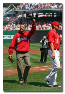 Screw baseball. We want to see Obama body-check someone into the wall of a hockey rink.