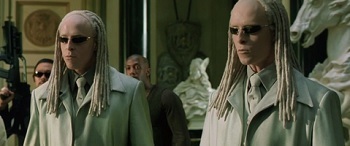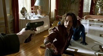 Quick, what do a feral child and a 7-foot-tall man with hooded eyes have in common? They're both clearly monsters. The first time we see the sex demon, back when our hero doesn't quite believe it exists yet and is tied up in a warehouse, it shows up as a completely naked woman for some daffy reason. Why not just roll in there as a cop like the T-1000? Or anything besides the weirdest goddamn thing it could think of? The second time, when our hero still isn't convinced, the demon shows up like this: