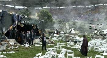 What I'm digging at here is that despite all his grandiosity, Magneto is really just making shit up as he goes along, like a Ben Stiller character. Later in the film, he decides to possess Trask's robots and turn them on the human crowd in a grand attempt to assassinate the president on live TV ... but not before making a flying entrance and dumping RFK Stadium on the White House lawn. He then makes a televised statement to the entire world, making sure that everyone knows Magneto is responsible for murdering the president and all his fancy friends.
