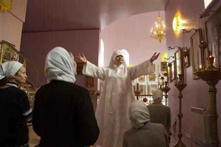 In 1996 she was jailed for fraud, and in prison turned to religion not because of Christ, but because of Putin. Since describing Putin as an incarnation of kickass is a pretty easy sell, and the same PR strategy he's using, she convinced others to join her in a convent in Bolshoya Yelnya. It's basically a bunch of old ladies who've decided this is the only way they'll be able to get on their knees for services to Putin's manliness at their age, and they're going for it.
