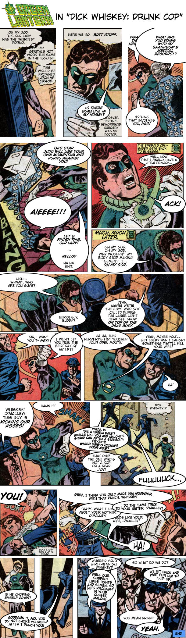 Green Lantern has a magic space ring that can do anything, and it's his job to patrol an inconceivably giant section of the universe. So imagine you were a man, with a man's needs, all by yourself in space, with a ring that can do anything. Your imagination just conjured Man Comics Presents: Green Lantern: Star Pervert. Great job.