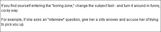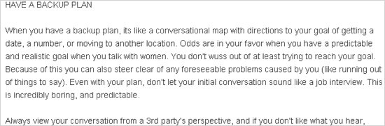 Plan your conversations in advance, people, it's, somewhat paradoxically, the only way to keep them from being stale. If you're boring, a woman will scamper off or perhaps wander into traffic.