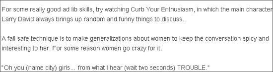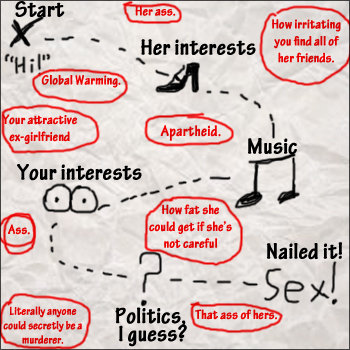 So you've approached your target and you haven't exceeded a four on the scale of creepiness (or else she would have alerted the authorities), and now you need something to say. We turn again to Seduction Chronicles for advice: