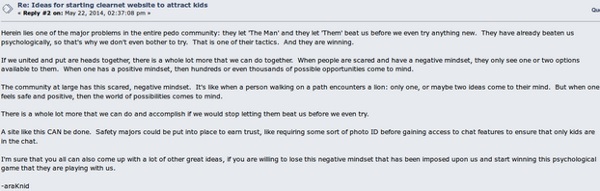 Since basically everyone on 7axxn was guilty of more federal crimes than your average Batman villain, membership was heavily restricted. Like that creepy rich people sex club from Eyes Wide Shut, the only way in to 7axxn was to get an invitation from a current member. Some of those members hung out in a less-restricted Tor chatroom, but it looked like gaining their trust would require breaking the law: "If you didn't provide a link to child porn every 10 minutes, you were kicked off," says Pam. This whole "incriminate yourself to get inside" attitude was common among pedophiles of the Deep Web: "There are a lot of forums that don't even allow new members unless they submit an application where they upload examples from their own CP library. I wasn't about to even try that."