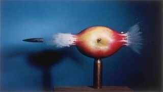 High-speed photography captured a bullet hitting an apple midair, showcasing stroboscopic precision in lab experiments.