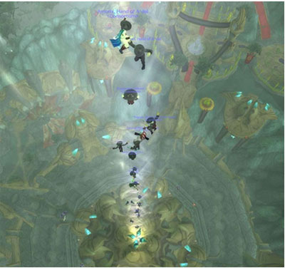 If you're not sure what you're looking at there, 25 or so players gathered around this shaft of light, summoned "mounts" (flying creatures) to fly to various heights, then all jumped off simultaneously so they could take this snapshot of them suspended in the beam, a split second before they all plummeted into a broken pile on the ground.