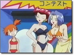 In Beauty and the Beach, Team Rocket enters a "Beach Beauty and Pokemon Costume Contest" as part of their ill-defined nefarious scheme to kidnap Ash's Pikachu so it can power a doomsday device. And because it makes more sense than anything else in the history of the show, this means the male character James has to throw on a pair of giant breasts for the swimsuit portion.