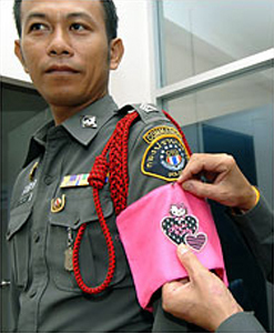 Yes, the Bangkok police forced their errant officers to wear special armbands featuring the likeness of Hello Kitty, the mouthless cartoon cat that survives on a diet of love, hearts, and pink everything. She became part of the official Thai police fuckup uniform.