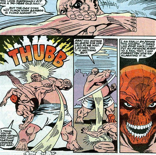 Remember, this is a comic book set in a world full of superpowers and fantastic technology -- if they wanted to, the writers could have easily made it so the villains simply scanned each other with X-rays to make sure they had no weapons. This clearly comes down to someone at Marvel really, really wanting to see Kingpin and the Red Skull punching the shit out of each other without clothes. The biggest blows, however, are verbal: