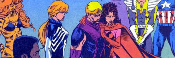 Naturally, he ends up crawling back to the team ... until said no-longer-soon-to-be ex-wife dies and Hawkeye quits again to mope around in his own solo miniseries. More importantly, he seems to have figured out that there's a problem with the name of the group: