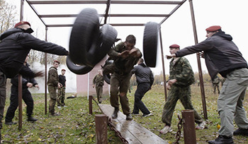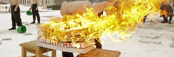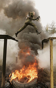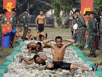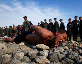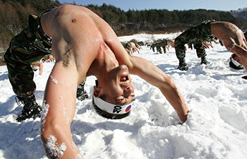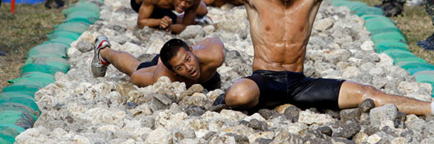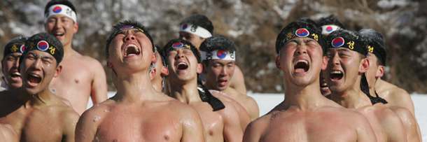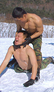 Each winter, more than 200 of South Korea's finest Special Forces soldiers travel to the icy region of Pyeongchang to train in negative-30-degrees Celsius. For those of you who measure temperature with an F instead of a C, that figure converts to "nipple-chafing ice planet." Once they've all stripped down to half-nakedness (presumably so that said nipples can be used as bayonets), the Winter Olympic Games of the South Korean Special Forces begin. In addition to the marathon above, events include wrestling: