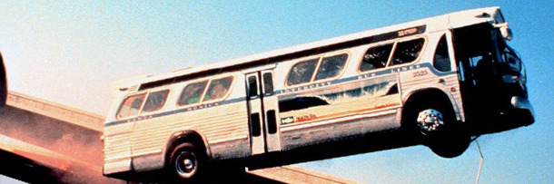 In Speed, a bus carrying Keanu Reeves is forced to keep going at breakneck speed because there are explosives on board rigged to blow if it drops below 50 mph. In the most ridiculous scene generated by this ridiculous premise, the bus is forced to jump an incomplete stretch of freeway and land at full speed. It's the physics equivalent of a rhino doing a backflip.