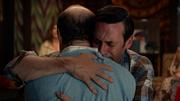 The finale finds Don Draper in the middle of an existential crisis. After conversations with his daughter, dying ex-wife, and best friend / former protegee don't really evoke any meaningful change, Don gets dragged to a support group, where he ends up hugging it out with a random dude.