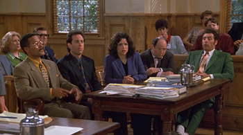 The gang is then arrested and put on trial for failing to be "Good Samaritans" -- meaning that the subject of the trial is the very worthiness of their souls. Interestingly, the judge's name is Art Vandelay, George's go-to pseudonym for his elaborate deceptions. This isn't just a throwaway joke; it's a sign that this trial isn't a random bit of happenstance. It's the Universe reflecting these characters' moral ineptitude back at them. Their disregard for humanity has been made manifest and is here to judge them, and those who have been wronged throughout the show's wacky adventures state their cases.