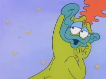 Beverly hires Rocko to do some random house chores for her, but it quickly becomes obvious that she wants him to use his rough hands for something other than changing light bulbs. First she tells him to watch a documentary with her. It's about the mating habits of cane toads, and considering Mrs. Bighead's species, that makes it pretty much frog porn. When that doesn't work, Beverly steps up the creepy routine by spiking Rocko's drink with Spanish fly, which is what cartoons call roofies.