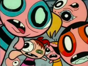 The Powerpuff Girls were made by Professor Utonium out of sugar, spice, everything nice, and the highly unstable Chemical X. But in the episode "Knock If Off," fake scientist (and Utonium's old roommate) Dick Hardly learns about the Powerpuffs' secret recipe and decides to make his own army of fingerless mini-psychopaths for profit. When the girls figure this out, they track Hardly to the abandoned warehouse where he performs his experiments, only to find themselves surrounded by the Cronenbergian equivalent of a fun house mirror maze.