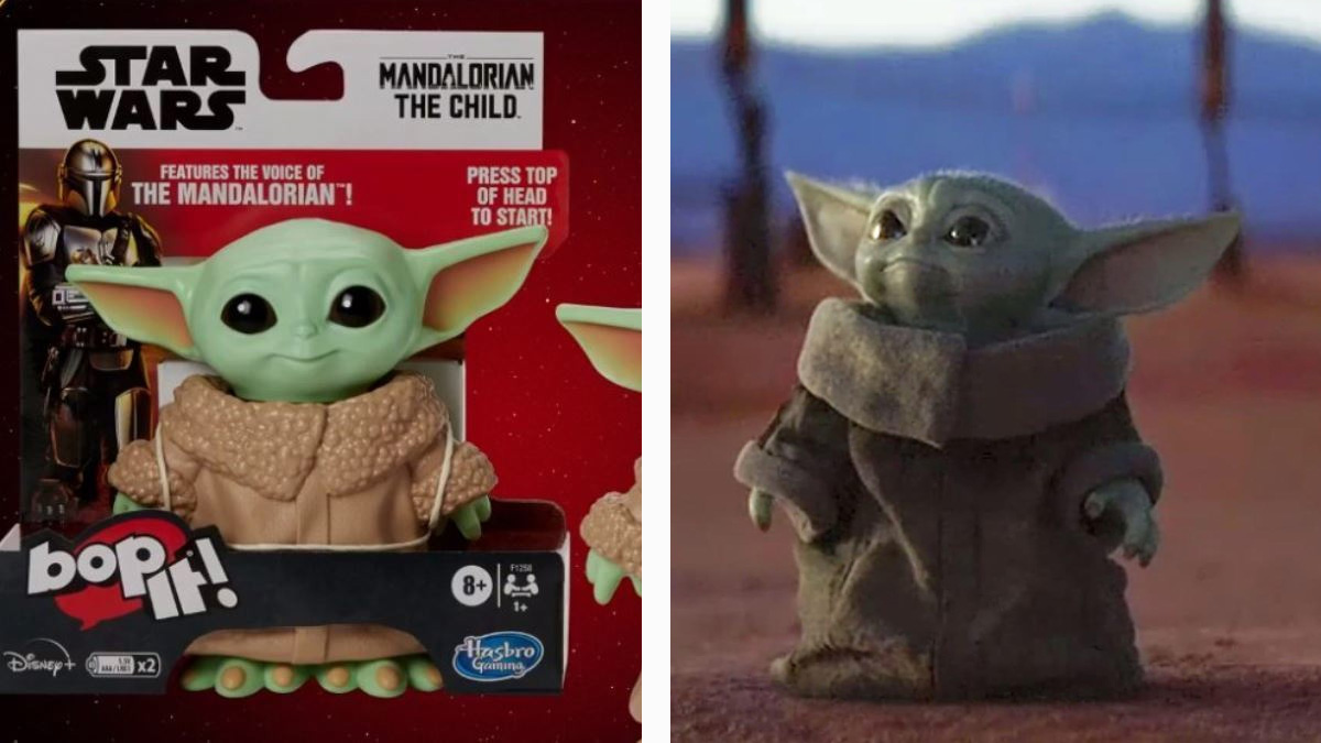 That's the Bop It!. It has no classic Bop It! iconography, like twisty knobs and pully thingies and smashable buttons that are to be pulled when the Bop It! voice commands you to beat it senseless for its sexual gratification. It's just the baby we love from that show we love, and then you beat the shit out of it. Disney got you hooked on a drug then tried to sell you the antidote, and the antidote was unrestrained savagery delivered on common like the mindless robot you are. The voice ordering you to pummel the baby and twist its limbs is none other than The Mandalorian, Pedro Pascal, himself. This seems like a complete betrayal of established Star Wars canon. Why would Mando spend an entire season of TV growing to love Baby Yoda ...