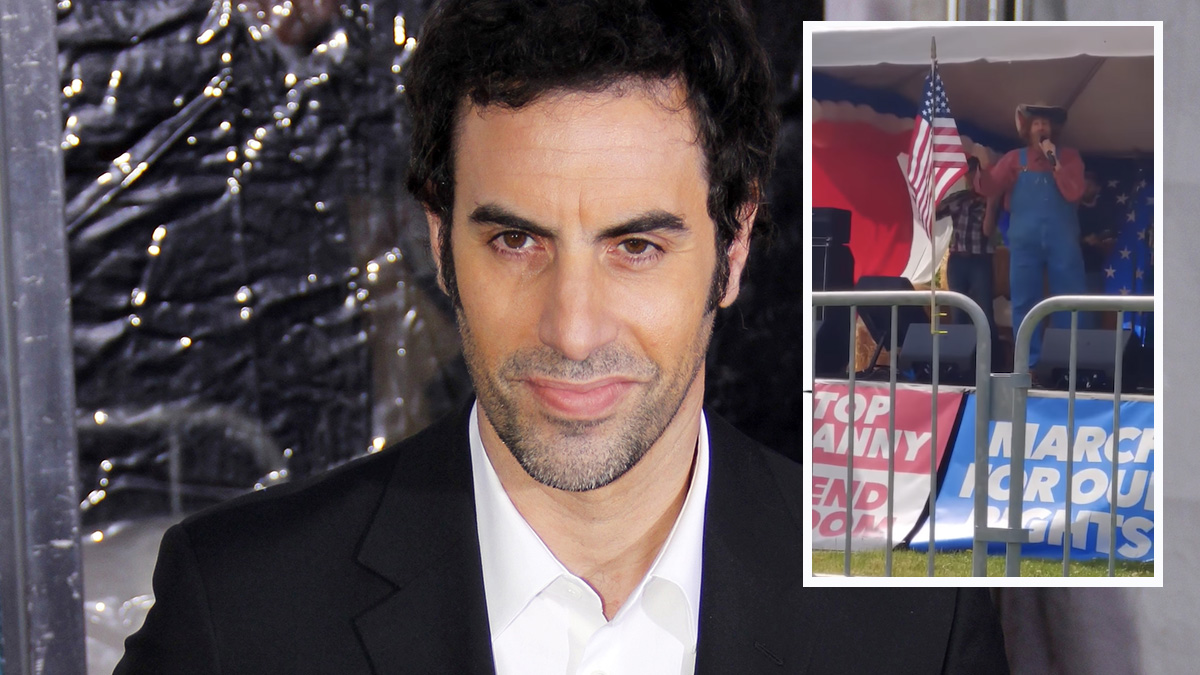 Last Saturday, 500 of Washington's most sunburnt alt-righters gathered in the state capitol for the March For Our Rights 3, a very late counter-rally to the 2018 March For Our Lives student protest against school shootings. It was a lavish affair, with the entertainment, equipment and security having been provided by a last-minute mysterious donor. But the Washington State Three Percenters, the rally's right-wing organizers, didn't realize that their benefactor was none other than Prankmaster General Sacha Baron Cohen, who boldly took to the stage disguised as a bluegrass singer goading these militia tools into a racist singalong.