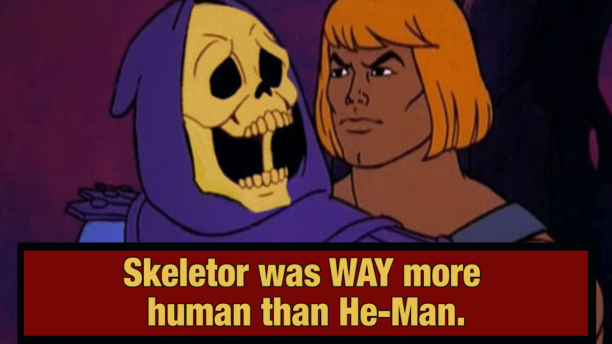 Whereas He-Man's only two moods on the show are "brave" and "punching," Skeletor exhibits a range of emotions you can actually recognize in other human beings. He gets super hyped up over his own plans, cheers joyfully when they work ...