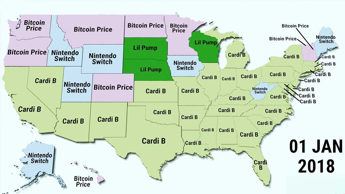 I started us off in 2018 because I think that stretch is so fascinating, but feel free to scroll through the whole video. I'm not sure what cultural differences are being expressed when most of the country is searching for Cardi B while the Northwest is searching for Bitcoin Price and parts of the north Midwest is searching for Lil Pump, but I find it comforting that immediately we can all switch to searching for Logan Paul on a dime and then, immediately after, jump to Fortnite.