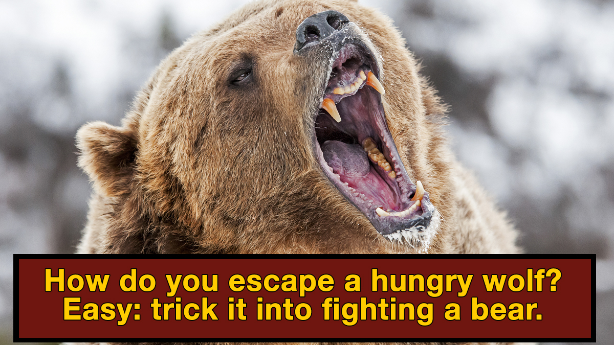 Logically, running away from the bear while screaming and flailing both hands up in the air was the default plan of action, but Barnaby had a better idea. She saw that the mama bear had a cub. She approached the cub and prayed to all divine beings for some miraculous happenstance. Just like a charm, Barnaby heard a big crash behind her. The wolf and the bear engaged in a fight. Who started it? Who cares? Barnaby took the opportunity to escape, eventually finding her way back to the highway and a search party looking for her.