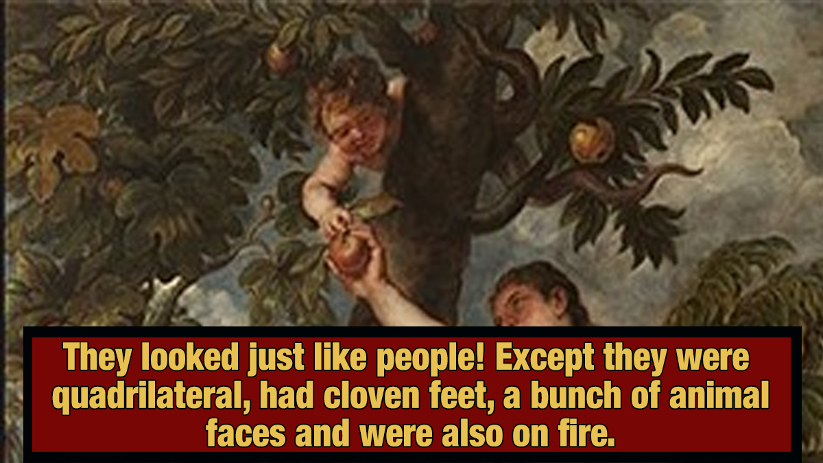 But the cherubim in the Bible are a little different: "In appearance their form was human, but each of them had four faces and four wings. Their legs were straight; their feet were like those of a calf... had the face of a human being, and on the right side each had the face of a lion, and on the left the face of an ox; each also had the face of an eagle. They each had two wings spreading out upward...and each had two other wings covering its body...The appearance of the living creatures was like burning coals of fire or like torches. Fire moved back and forth among the creatures; it was bright, and lightning flashed out of it." So they looked just like people! Except they were quadrilateral, had cloven feet, a bunch of animal faces, and were also on fire. No wonder we never made it back into Eden.