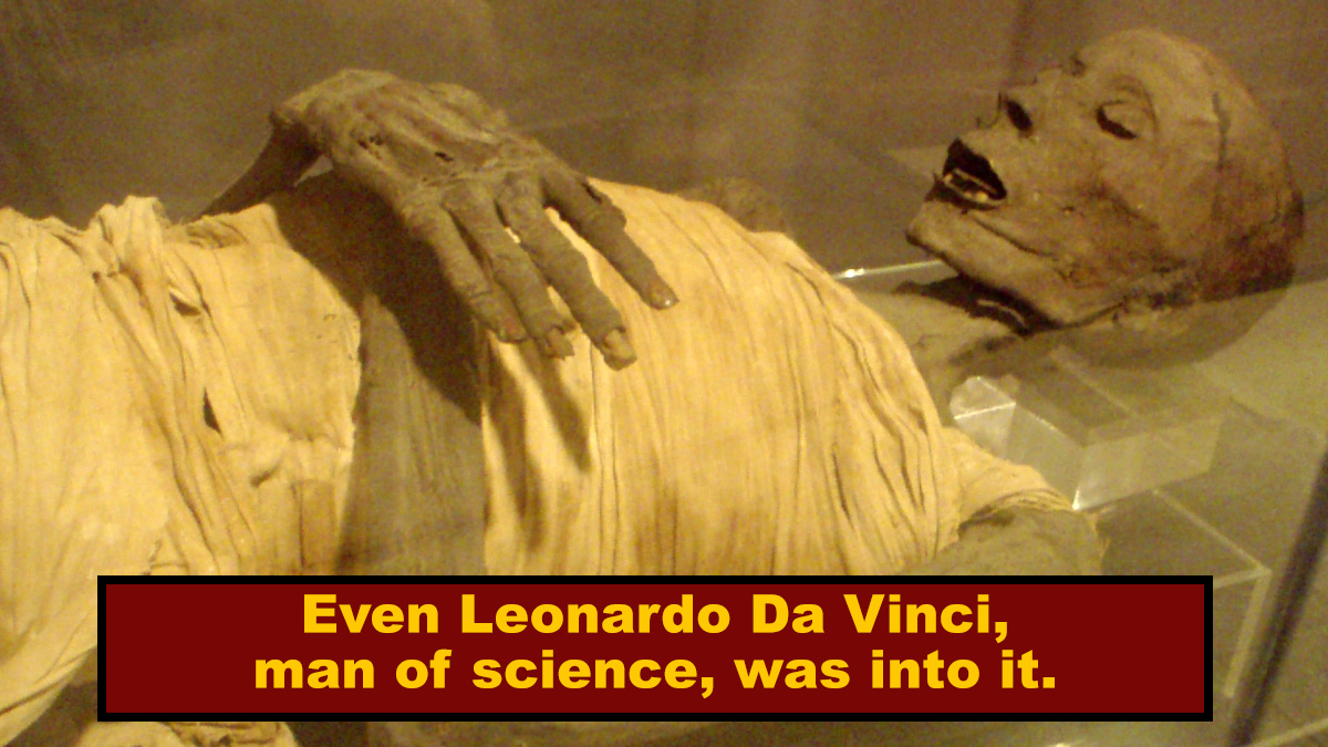 It was such a popular treatment that eventually, the mummy supply started running low, and just any dead body would do. King Charles II was known to drink a potion of alcohol and crushed human skull and henceforth as the most goth king, and poor people who couldn't afford to buy bodies to eat would show up to public executions and haggle for a cup of the condemned's blood. Even Da Vinci, normally a distinctly un–Gwyneth Paltrowish man of science, was into it. The practice only started falling out of favor in the 18th century, when people figured out how illness works (turns out it was germs all along), but you could find mummy powder in German medical catalogs right through the early 20th. That's right: We're only about as far removed from Charlie Chaplin as we are from prescription mummy.