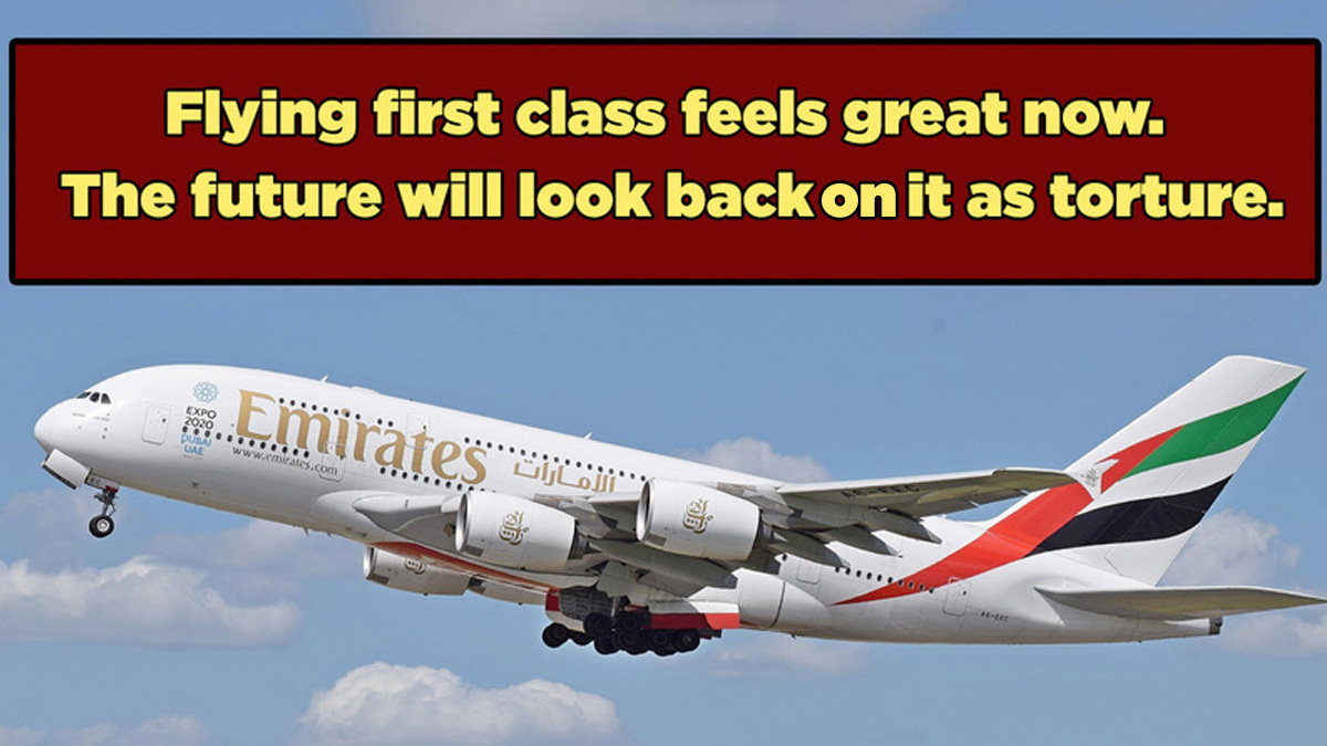 As with everything we're talking about today, I'm not trying to convince you you're dumb if you want these things now. Offer me a free first class ticket, and I'll grab it and have a great time, not scoff and say I'd be equally comfortable in the overhead bin. I'm just saying the time may come that the inconveniences we now barely notice will appear so great that comfortable slippers and a deluxe top hat will do nothing to make up for them. On the other hand, not all kinds of flying will lose their charm to the people of the future ...