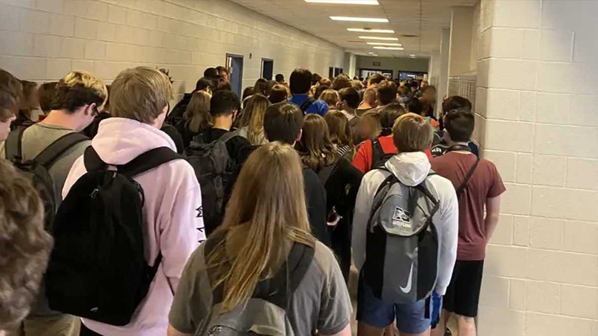 High school can be a tough time for everyone. Your body is changing. You're adapting to new social situations. You're jam-packed in a hallway during a pandemic, and you might get suspended for taking a photo of that hallway. Such was the case for Hannah Watters and another unnamed student who posted these photos to social media, which quickly went viral:
