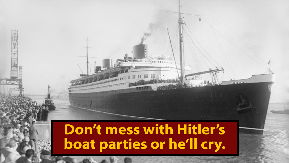 Still, he didn't dare try to promote it to the level of the national flag. It was strictly the flag of the Nazi Party, to be flown alongside the German Imperial flag. That is until some mean ol' protesters ruined their fancy boat party.