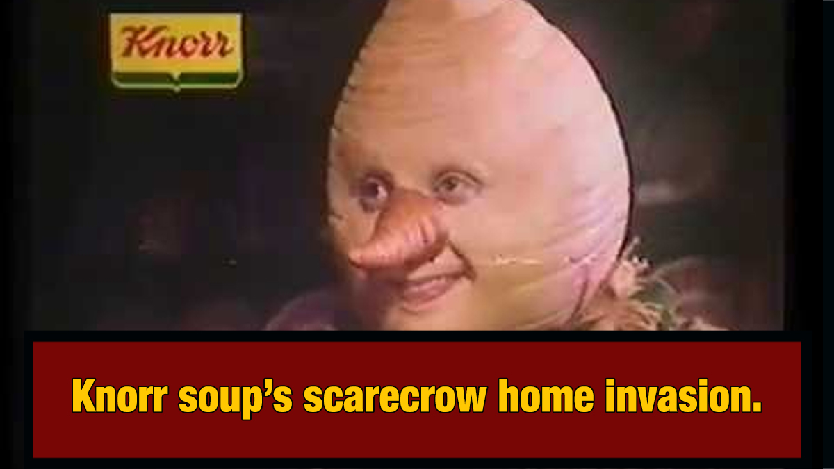 The ad's biggest failure though may be all the crosscutting between Knorr soup and filthy mud puddles, forever linking in them in your mind. But mud splashing is the least gross thing the scarecrow did with fluids tonight, so it's just as well that you think only of mud when you hear the ad's tagline: "Knorr soup. So good, you go schloup!"