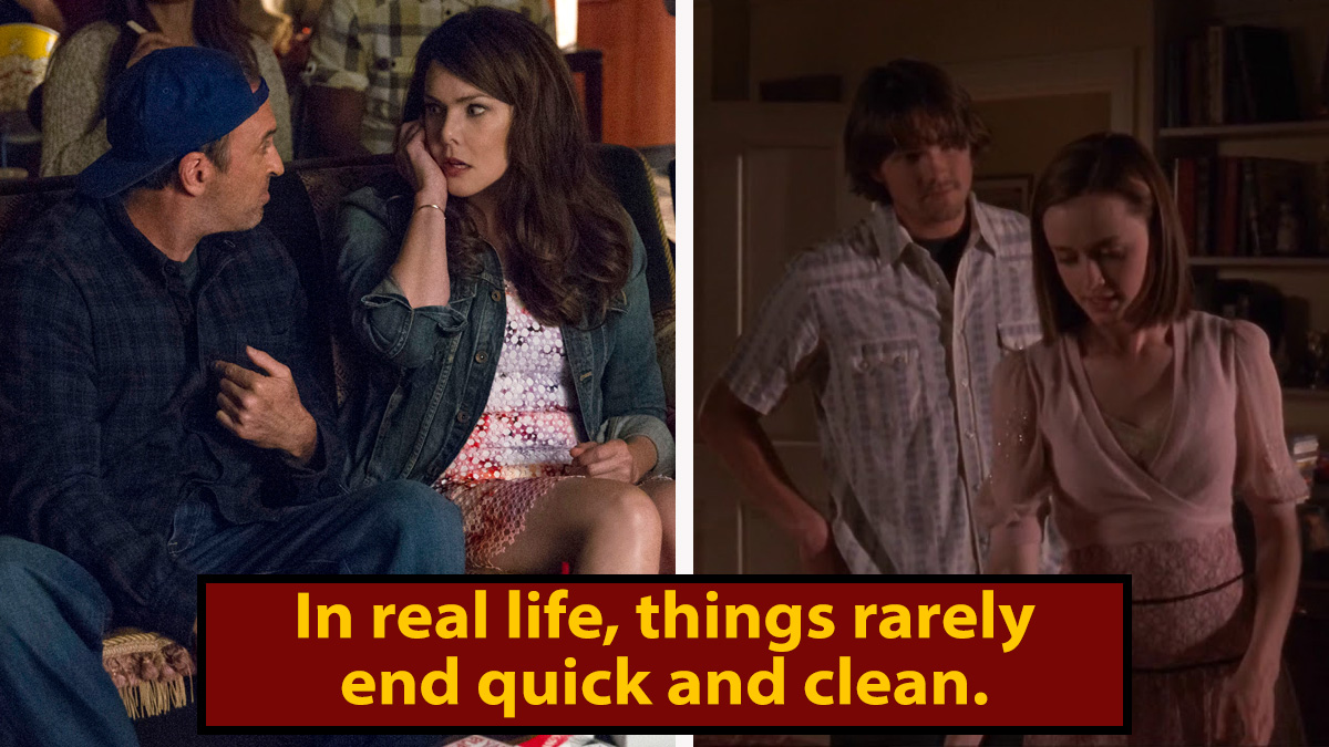 Gilmore Girls got that. Relationships didn't really come to definite ends. Even after Lorelai calls off the wedding of the first major guy she dates, Max, there's still weird chemistry between them. They even make out later, and it only ends when Max tells her that he needs to get away from her. When Jess and Rory split, the angsty little poetry nerd doesn't even break up with her properly. He just hops on a bus to California while Rory tells him that she's gonna move on. All Rory's major boyfriends pop back up in the series, by the way, to either re-date or try to re-date her. The same goes for Lorelai's.