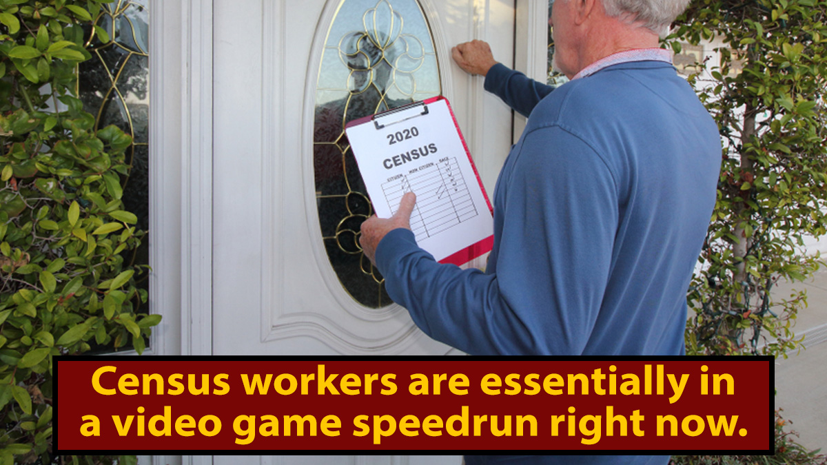 But, like clockwork, Donald Trump has shown up to take a bad situation and make it notably worse. The President has moved the initial deadline for the Census up by a month, despite the Census Bureau telling congress they needed to push their deadlines back to April 2021 due to COVID-19. So now the Census workers are essentially in a video game speedrun, except the game is, "Count the non-mask-wearing dildos and dodge the COVID particles they spit at you." Kenneth Prewitt, the Columbia University professor who oversaw the 2000 census, says, "If the current situation holds, I do not expect a census of the quality that the Census Bureau will even want to release the data."