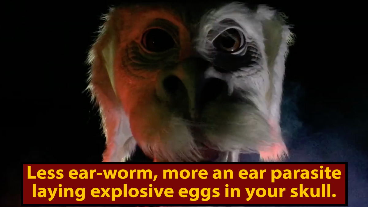 We wouldn't call this an ear-worm so much as we would an ear parasite that lays explosive eggs inside your skull. It's disturbing, but it's made even more haunting because Falkor was dragged into it. Here he takes the role of a stalker who breaks into your home, presumably to carry you off to the magical land of "unmarked white van."