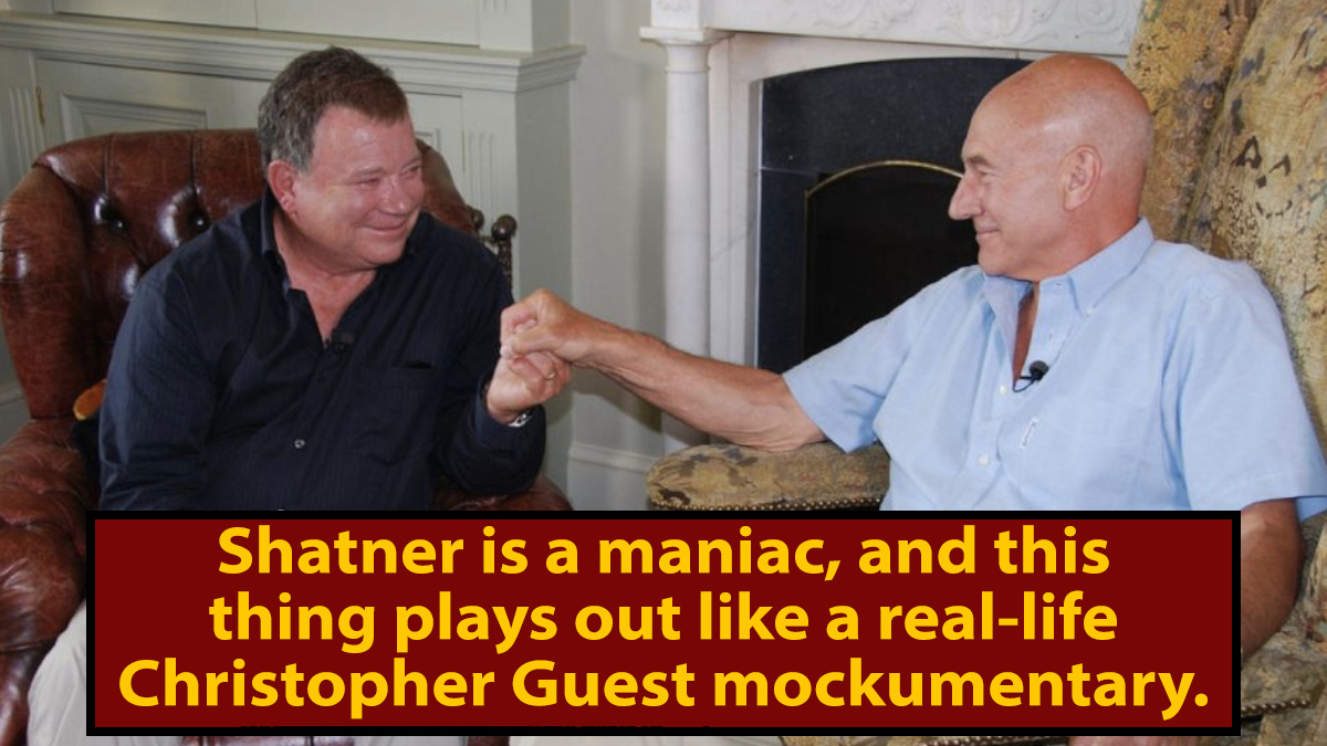 Mulgrew politely proceeds to talk about gender inequality in Hollywood, which causes Shatner to go on a confusing, kinda angry, tangent equating her stresses as a working single mother with his jet lag during the interview he's currently conducting. And while all this is happening, what sounds like a John Tesh CD never stops playing in the background. He also talks to Sir Patrick Stewart, whose face is blurry, but whose patterned armchair is in perfect focus.