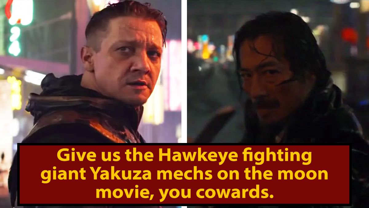 Midway through Avengers: Endgame, Black Widow heads to Tokyo to recruit Hawkeye for some lighthearted, time heist-shaped shenanigans ... and finds him in Ronin-mode, slaughtering a small army of yakuza goons and their boss, Akihiko. It's obvious from this scene that Akihiko and Hawkeye have some history ("Why are you doing this?!"), but we're unlikely to ever get those details. Though it's possible Akihiko was just talking about Hawkeye's eDgY tattoo sleeve.