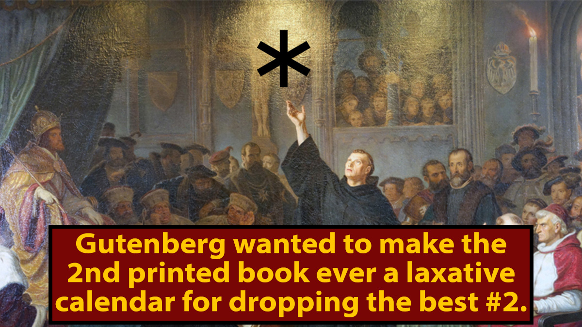 Which isn't really the image most school children are left with after being thought about Luther nailing his 95 Theses on the church door, but that's only because teachers leave out the fact that he did it under the statue of a rabbi french kissing a pig's butthole. Or the fact that he later denounced the Roman Catholic church by called indulgences "an utter shitting," and Pope Paul III a "little ass-pope" who licks the devil's butthole and farts so loud that "it is a wonder that it did not tear his hole and belly apart" -- in an open letter addressed to said Pope.